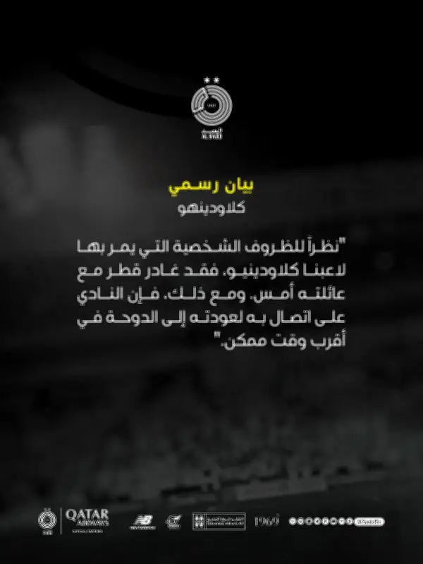ولم تتوقف الأزمة عند هذا الحد، حيث أعلن النادي أيضاً عن مغادرة نجمه كلاودينيو مع عائلته من الدوحة، مشيراً إلى أنهم على اتصال مستمر مع اللاعب لتسهيل عودته في أقرب وقت ممكن. هذا الغياب المزدوج يضع الفريق في وضع صعب، خاصة مع اقتراب مواجهة مهمة ضد نادي أم صلال.