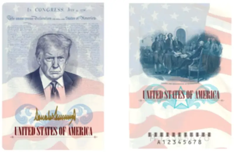 ووفقاً للمعلومات المعلنة، ستظهر صورة ترمب على الغلاف الداخلي لجواز السفر، محاطة بنص إعلان الاستقلال والعلم الأمريكي، مع توقيعه باللون الذهبي. كما ستتضمن إحدى الصفحات لوحة شهيرة تُجسّد لحظة توقيع الآباء المؤسسين على وثيقة الاستقلال.