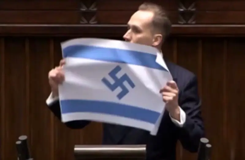 شهد البرلمان البولندي، في جلسة حديثة، حادثة استفزازية أثارت جدلاً كبيراً على المستوى المحلي والدولي، حيث رفع النائب اليميني المتطرف كونراد بيركوفيتش علماً إسرائيلياً معدلاً بشكل صادم، يحمل صليباً معقوفاً بدلاً من نجمة داود التقليدية.