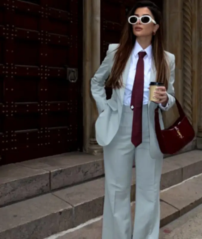 إضافة ربطة العنق كعنصر مفاجئ يرفع الإطلالة، لكن بشرط تخفيف رسميتها. يمكن اختيار ربطة رفيعة أو بقماش ناعم، وارتداؤها بأسلوب غير مشدود بالكامل، أو مع ياقة مفتوحة قليلًا. هذا الأسلوب يعطي طابعًا جريئًا وعصريًا بدلًا من أن يكون تقليديًا.