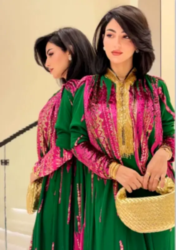 نصرة الحربي تبرز بجلابية خضراء وردية بتفاصيل ذهبية فاخرة