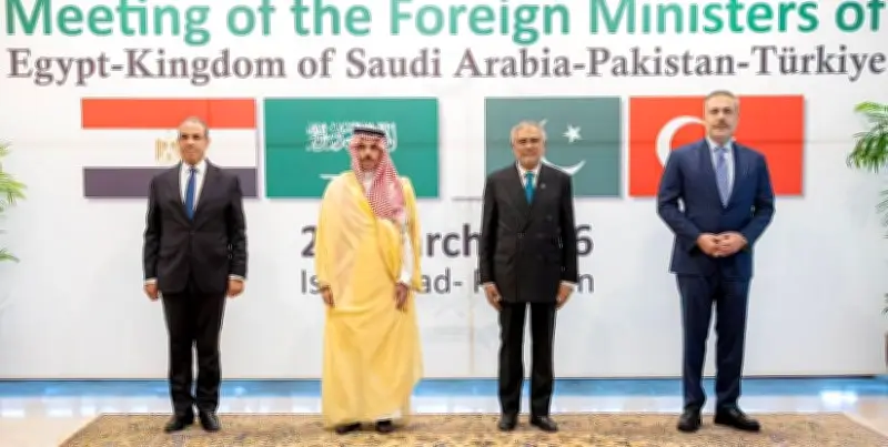 شارك الأمير فيصل بن فرحان وزير الخارجية في الاجتماع الوزاري الرباعي الذي عقد في العاصمة الباكستانية إسلام آباد، وذلك يوم 29 مارس 2026. وقد ضم الاجتماع نائب رئيس الوزراء وزير خارجية جمهورية باكستان الإسلامية محمد إسحاق دار، ووزير الخارجية والتعاون الدولي والمصريين بالخارج بجمهورية مصر العربية الدكتور بدر عبد العاطي، ووزير خارجية جمهورية تركيا هاكان فيدان.