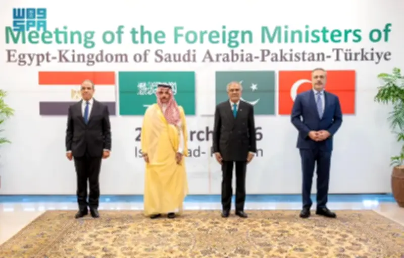 انطلقت في العاصمة الباكستانية إسلام آباد، يوم الأحد، أعمال الاجتماع الرباعي الوزاري الذي يضم وزراء خارجية المملكة العربية السعودية وجمهورية مصر العربية وجمهورية تركيا وجمهورية باكستان الإسلامية، وذلك في إطار مساعي مكثفة لتعزيز الجهود الدبلوماسية الرامية إلى احتواء التصعيد الإقليمي وبناء آليات فعّالة لتحقيق الأمن والاستقرار.
